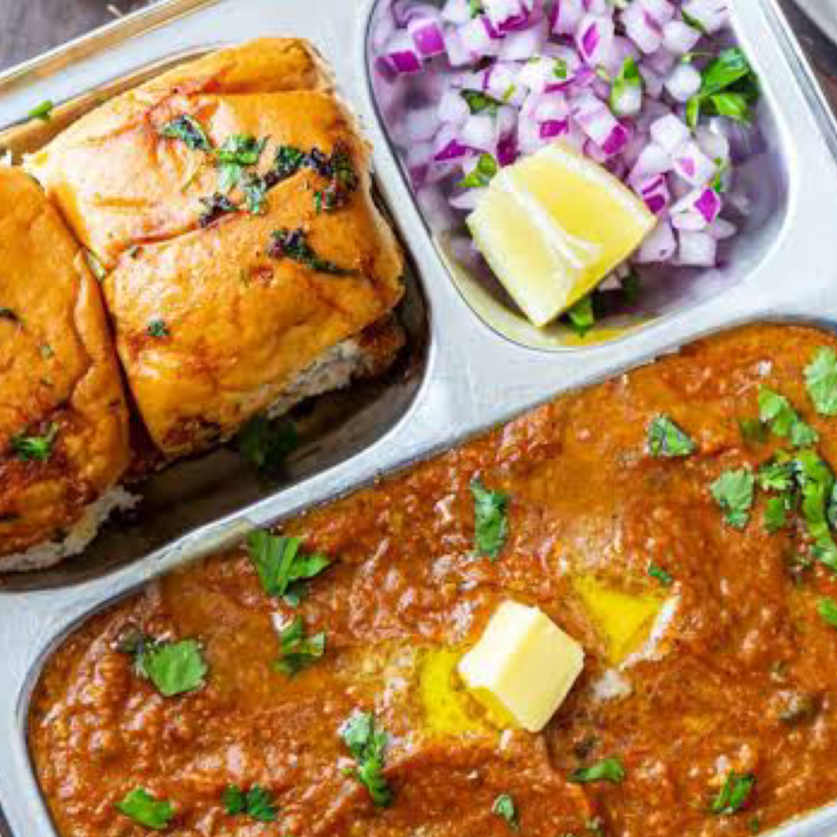 Spicy mix of mashed potatoes cooked in butter served with two pao (dinner rolls) along with mint chutney and onion salad