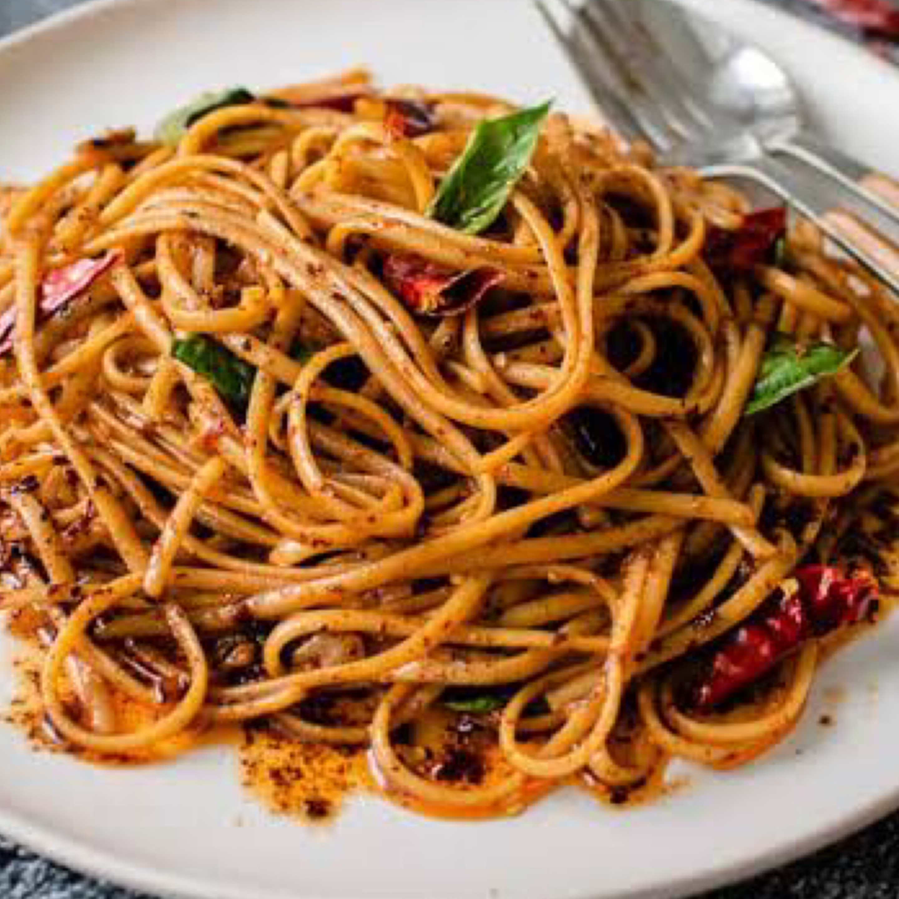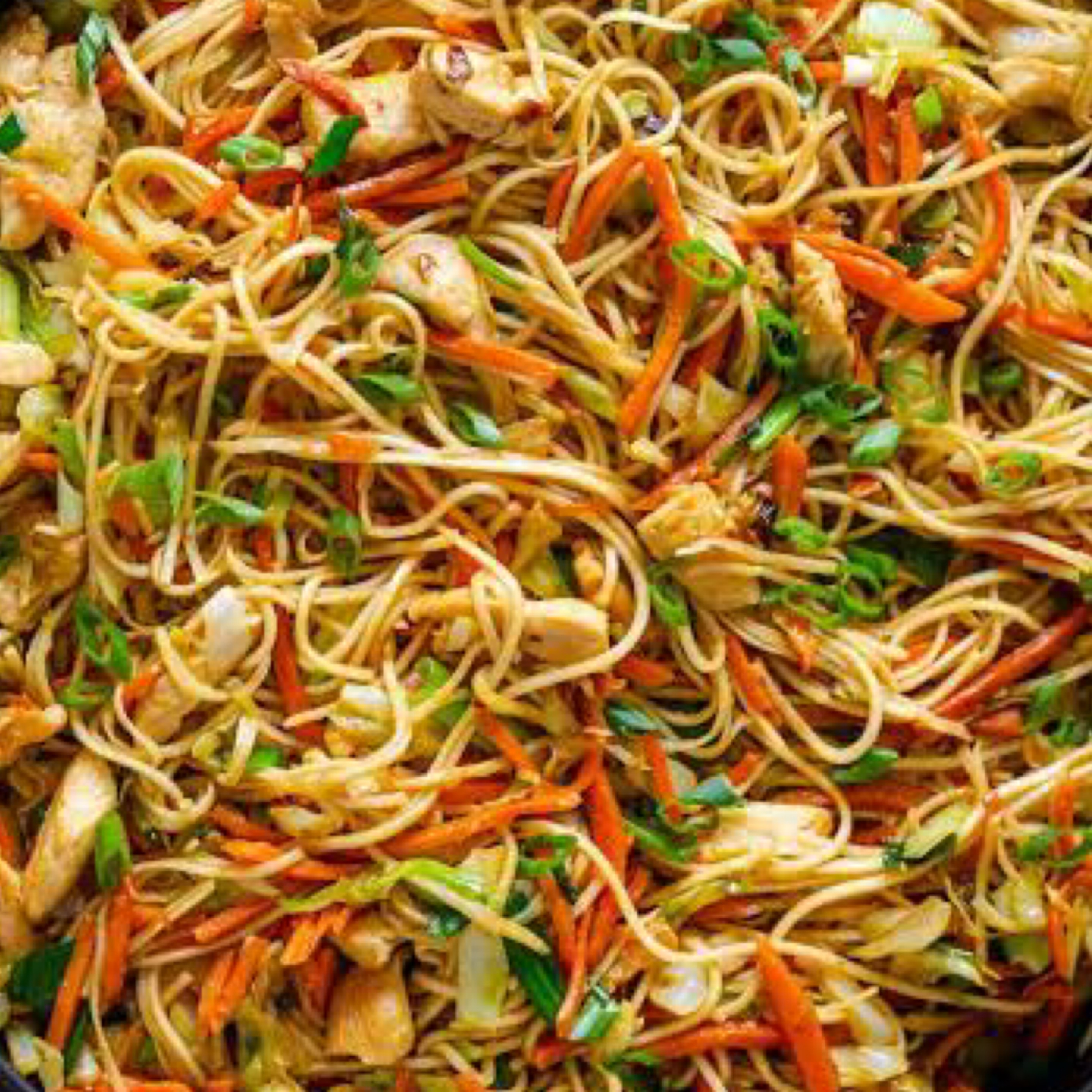 Noodles tossed with shredded chicken, vegetables, and soy sauce
