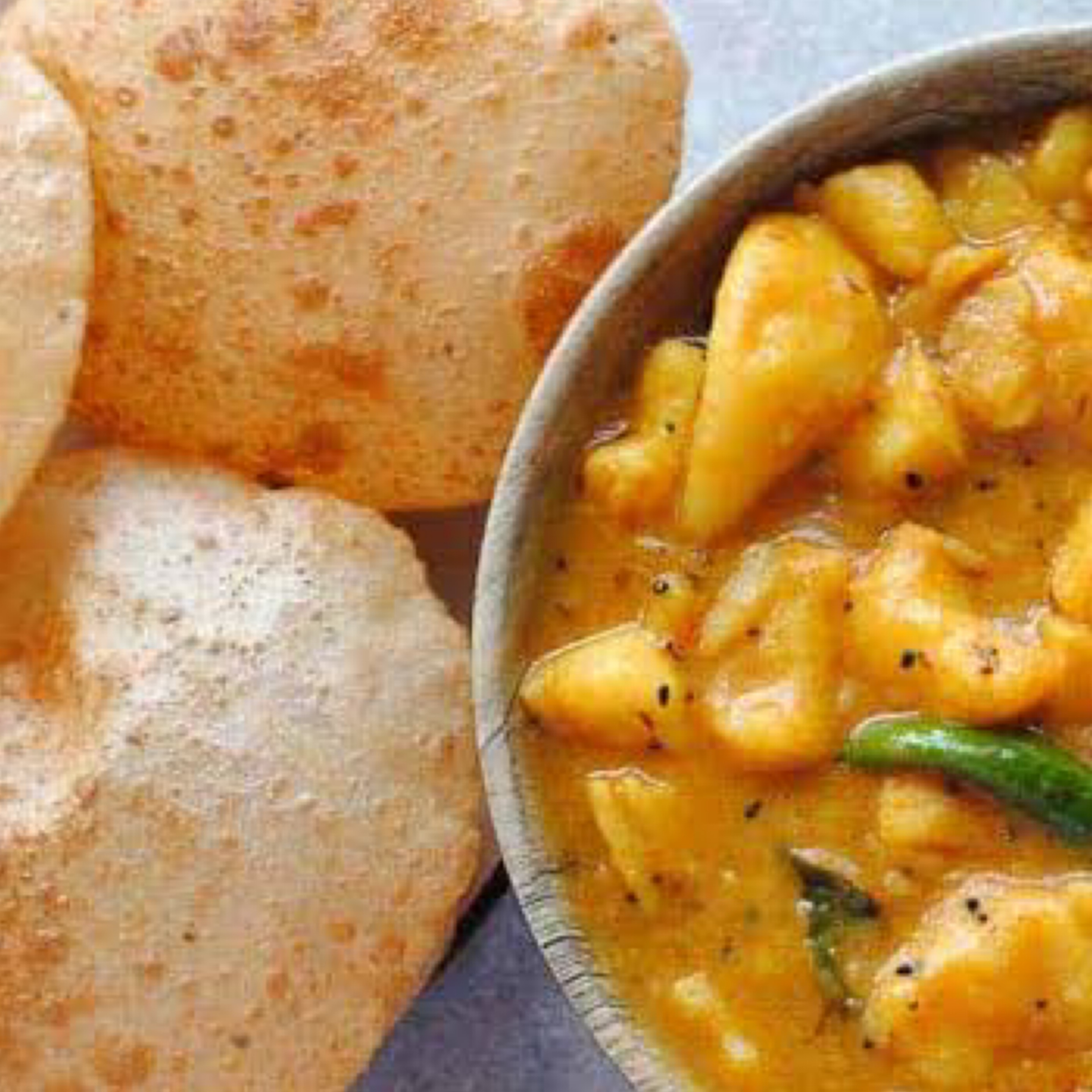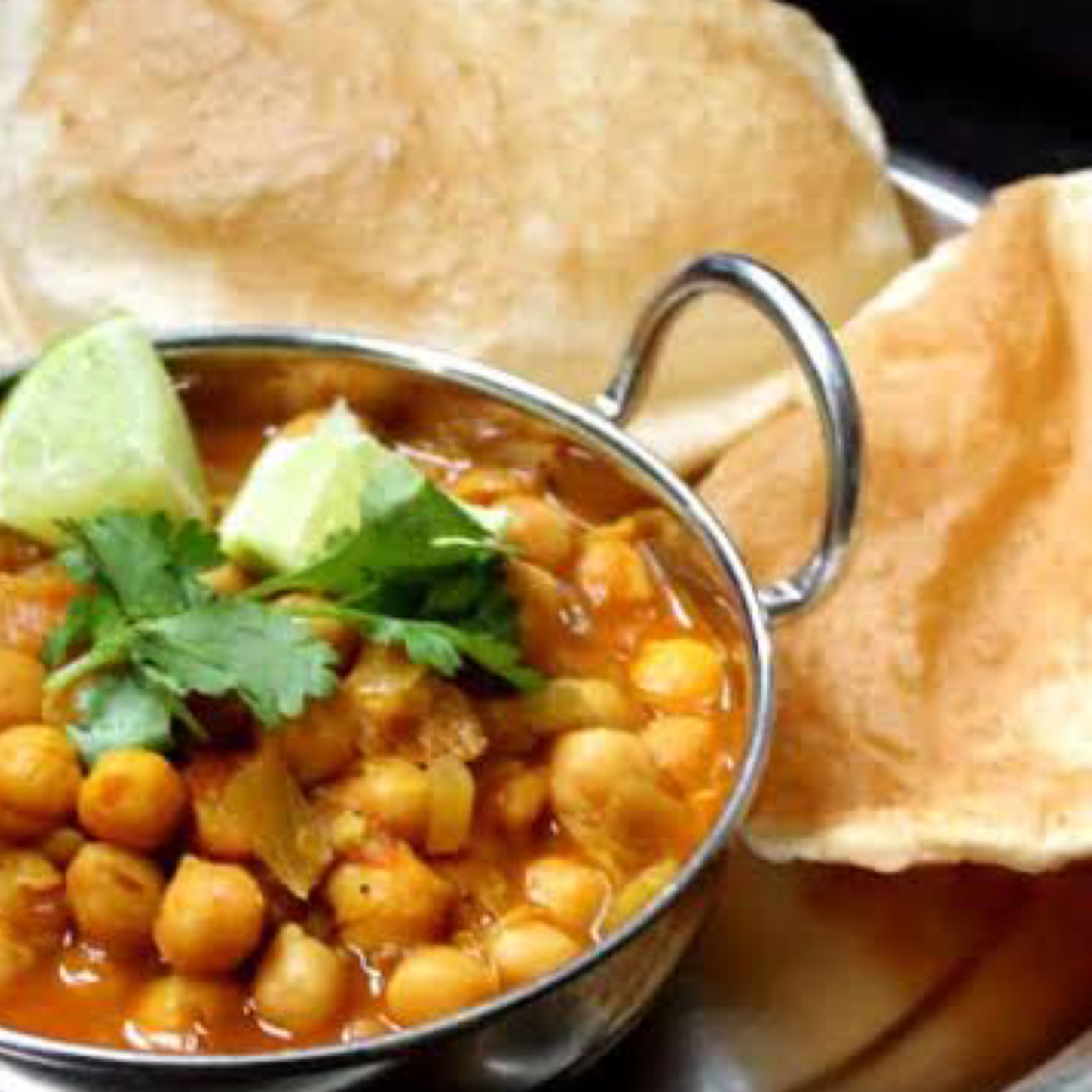 chickpeas curry served with deep fried breads served along with pickle and onion