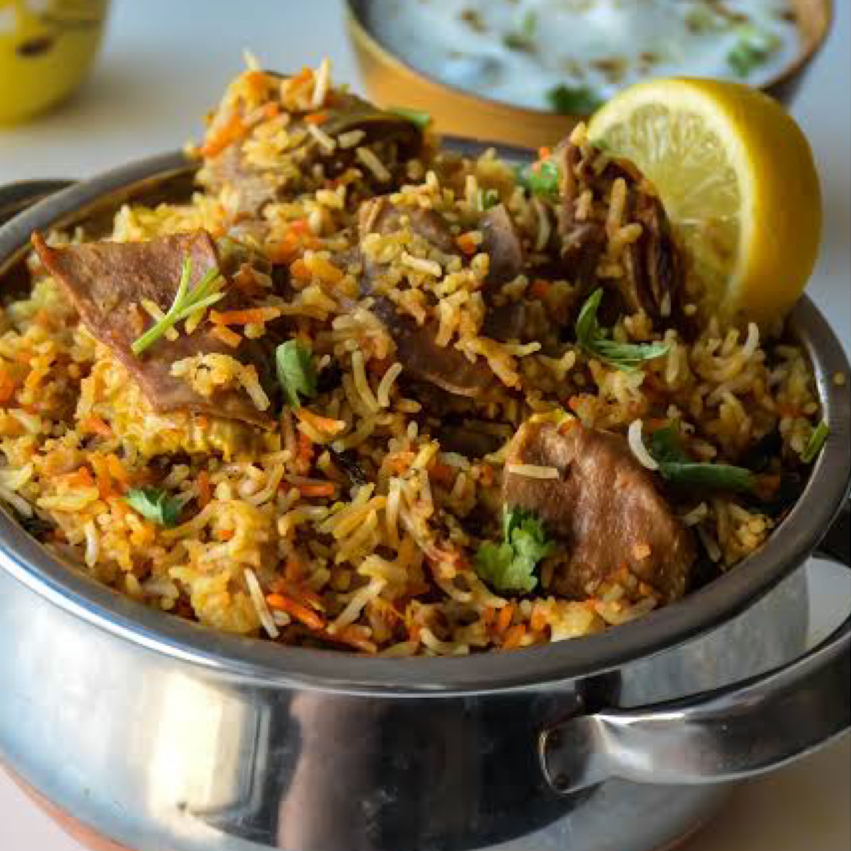 Succulent lamb/goat cooked with special herbs and served with rice