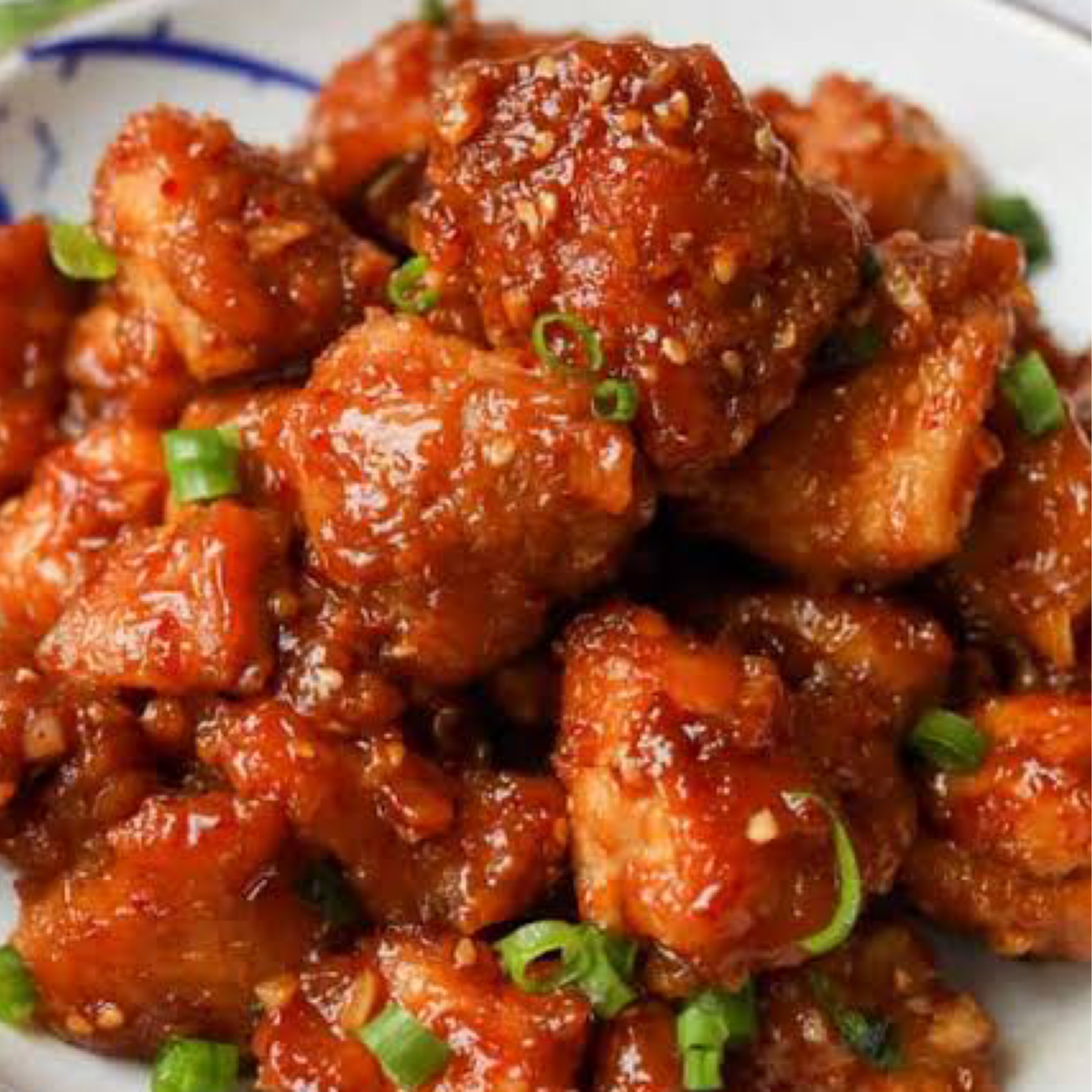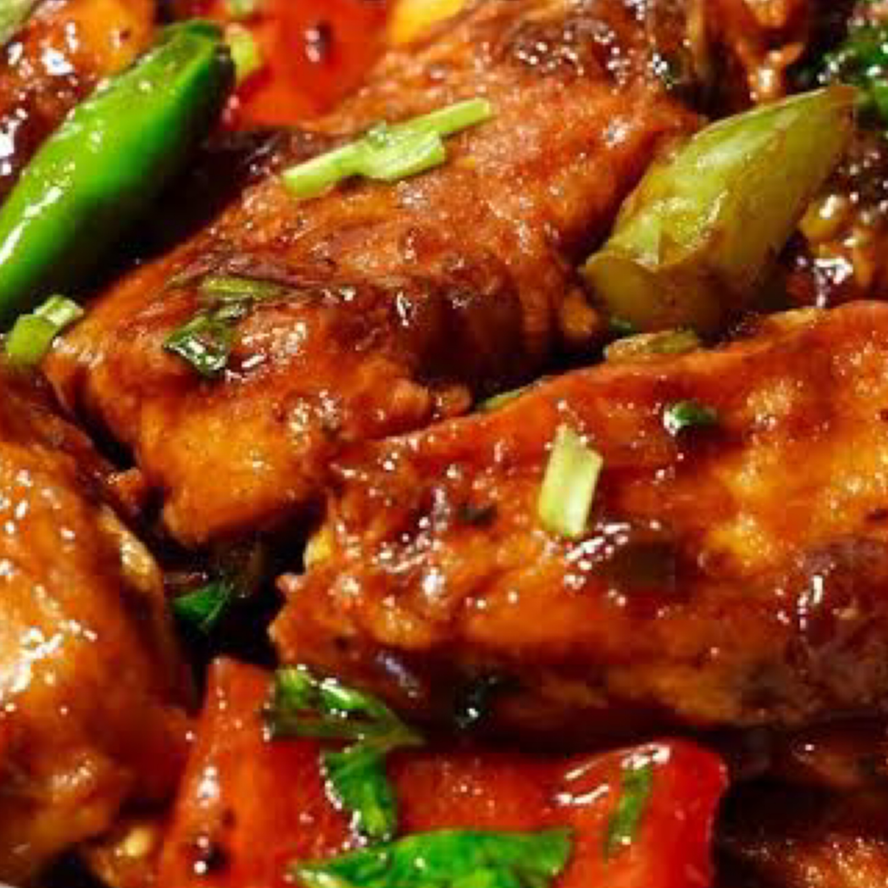 Batter fried chicken, stir fried in a spicy and tangy sauce