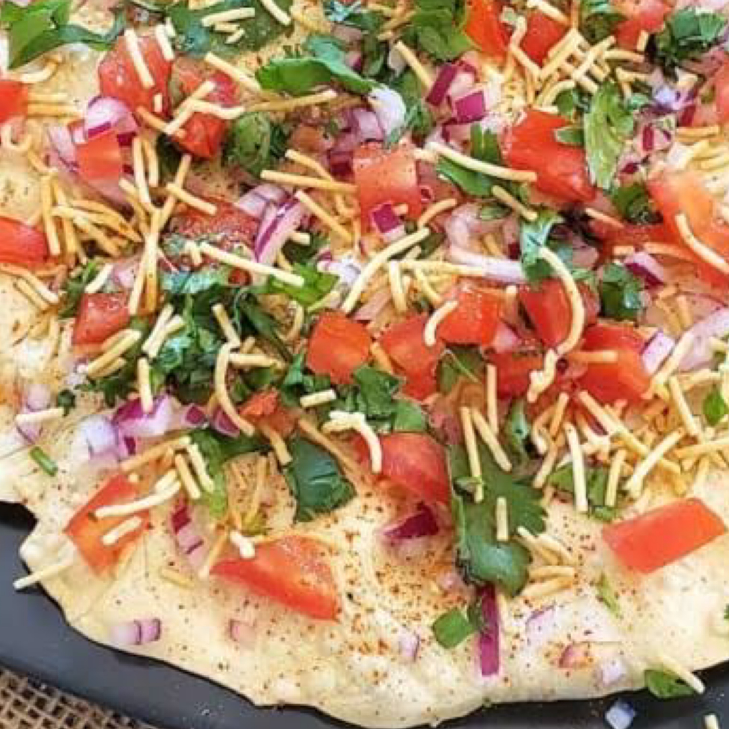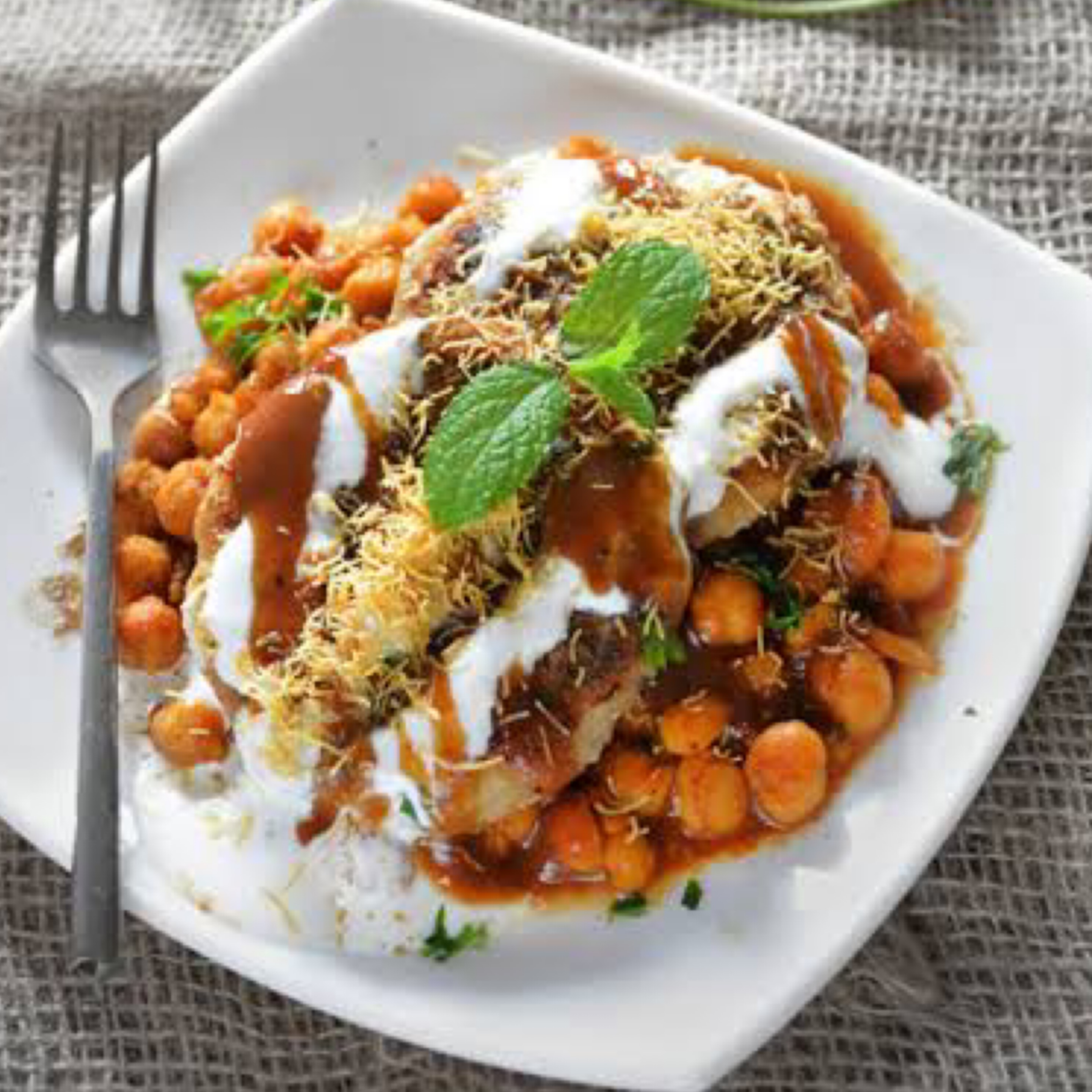 Crispy pastry tossed along with chickpeas and potatoes drizzled with sweet yogurt and various chutneys finished with roasted cumin powder