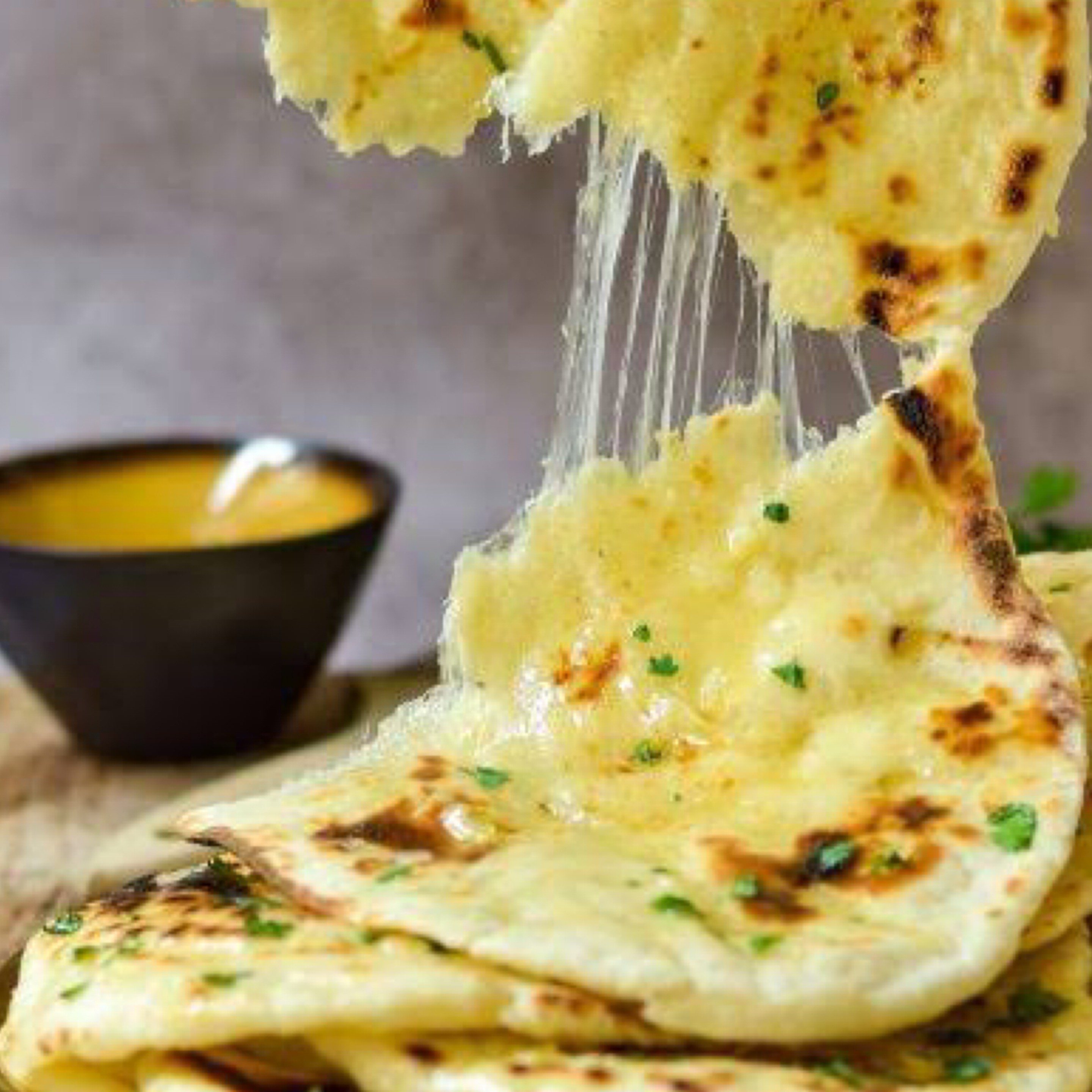 Naan stuffed with a mixture of cheddar and mozzarella cheese