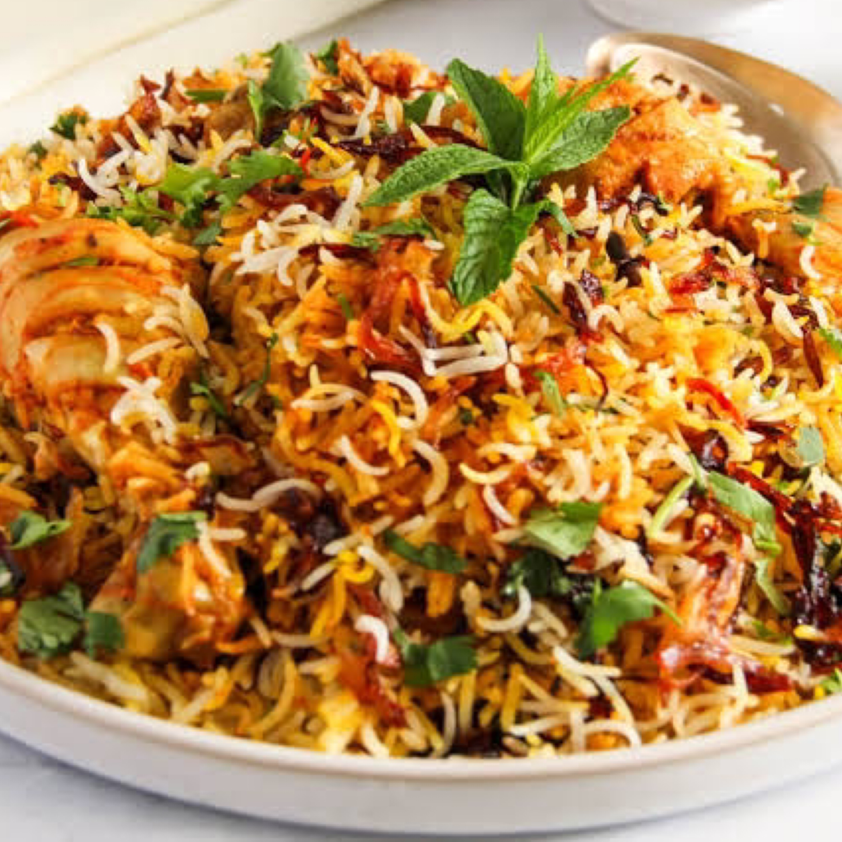 Biryani rice is layered with chicken 65 masala and fresh spices