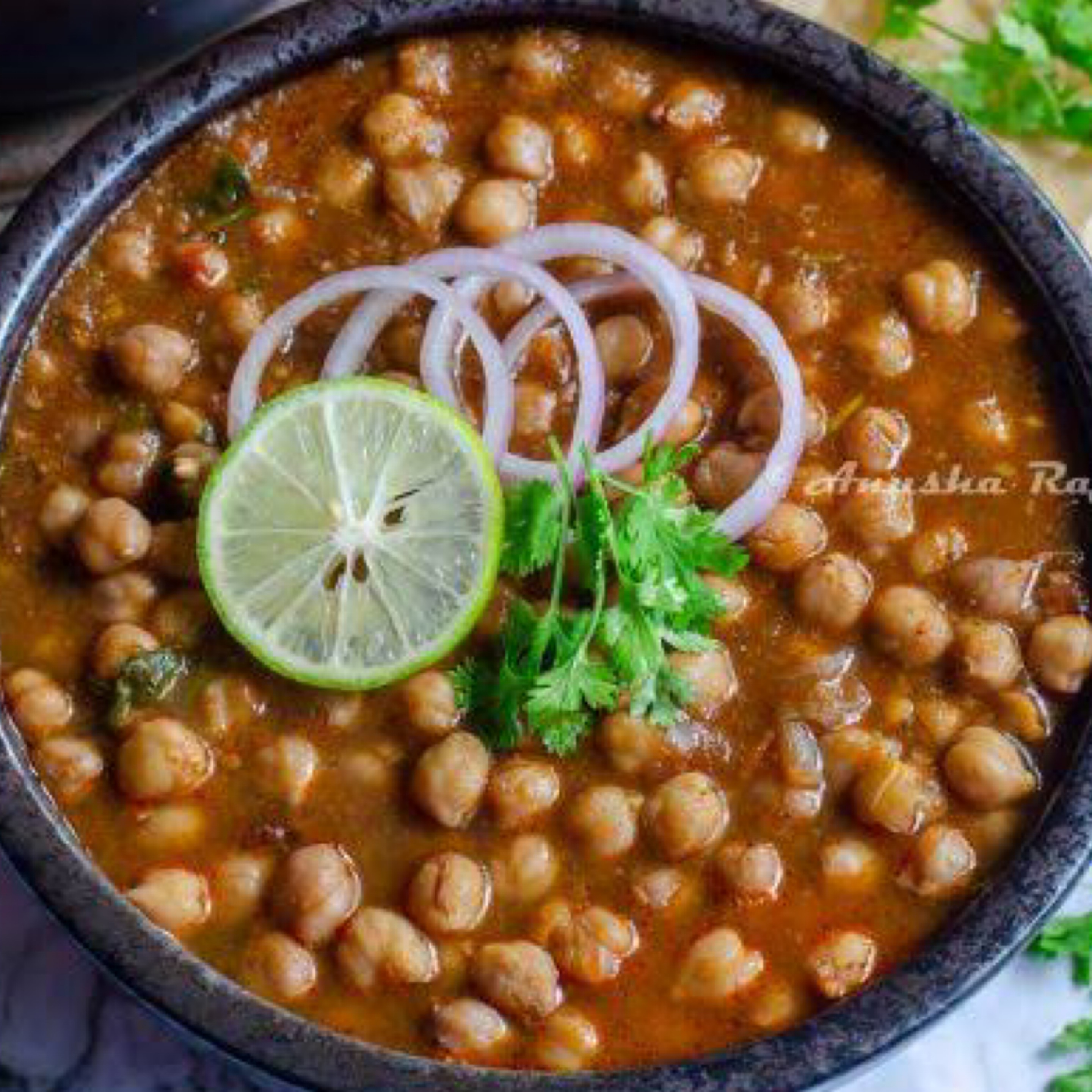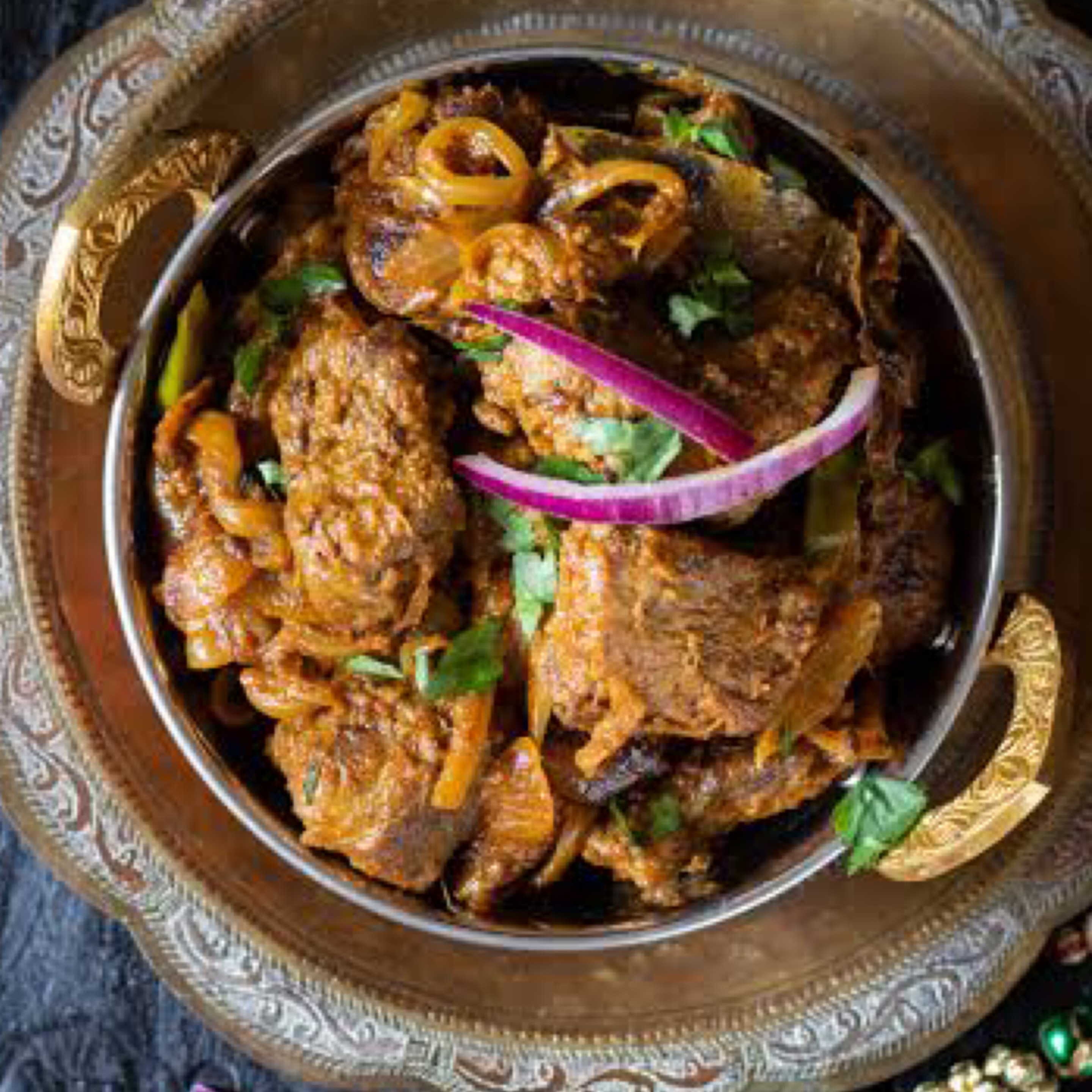 A delicious dish cooked with lots of spices and onions garnished with coriander leaves