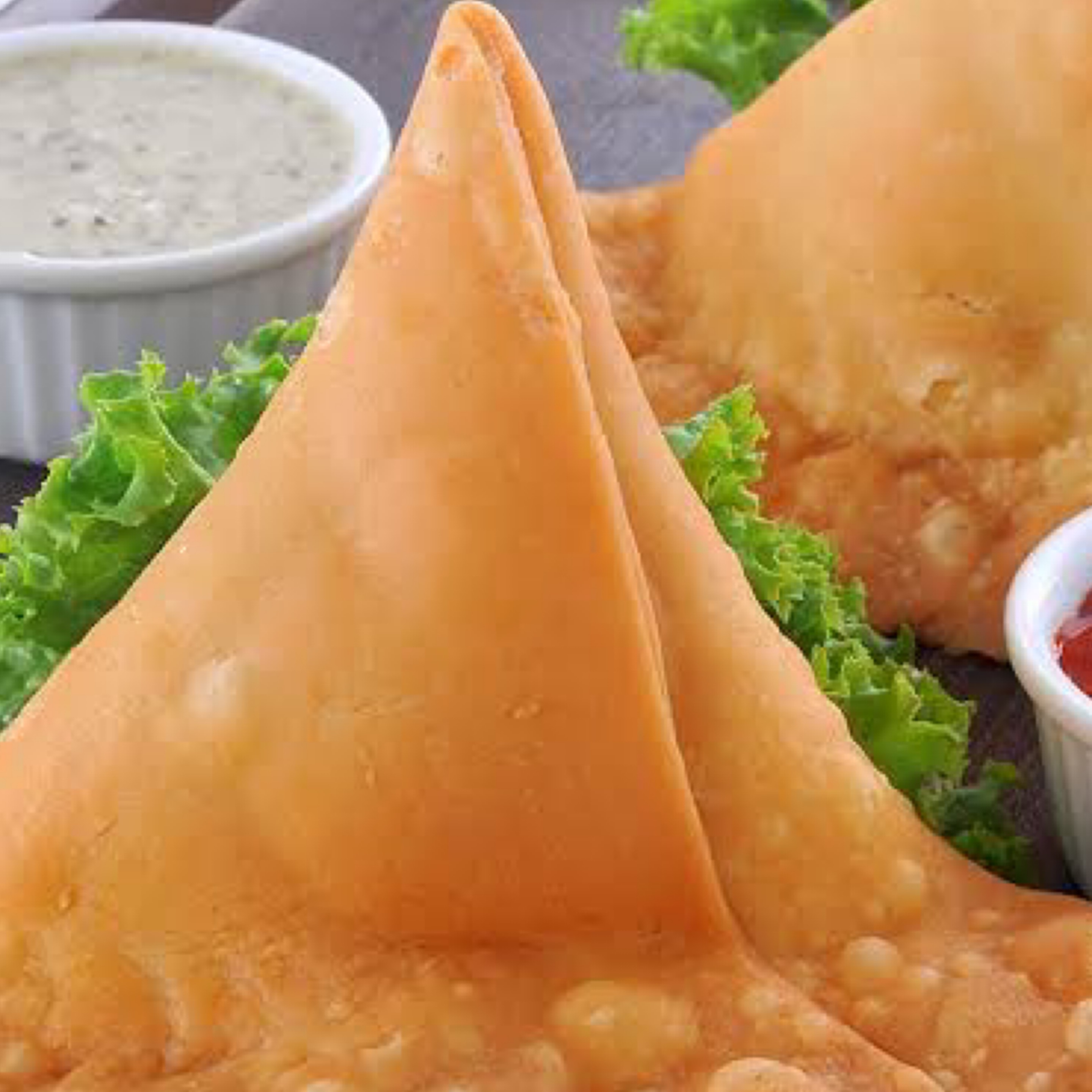 A crispy pastry filled with potatoes and peas. 2 pieces.