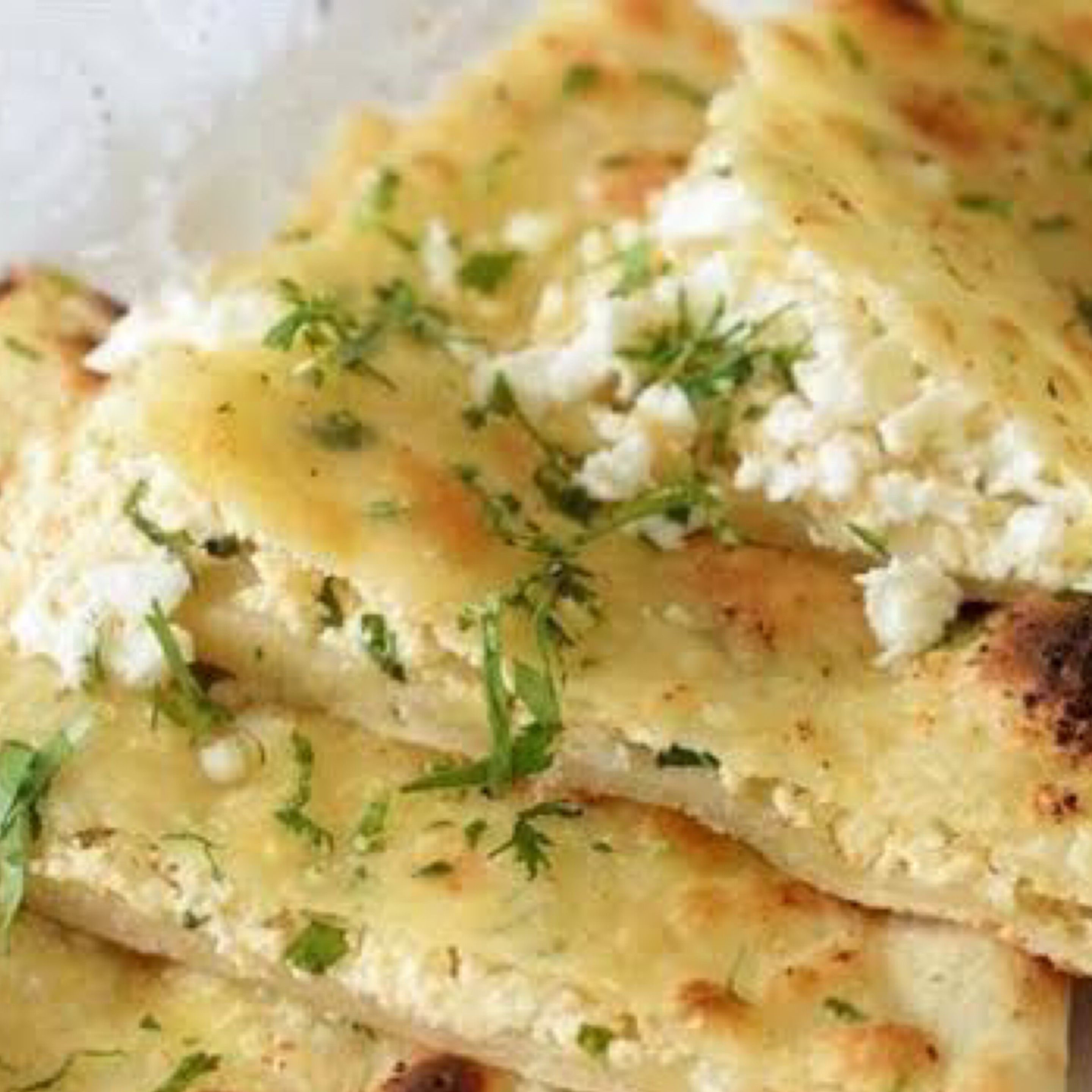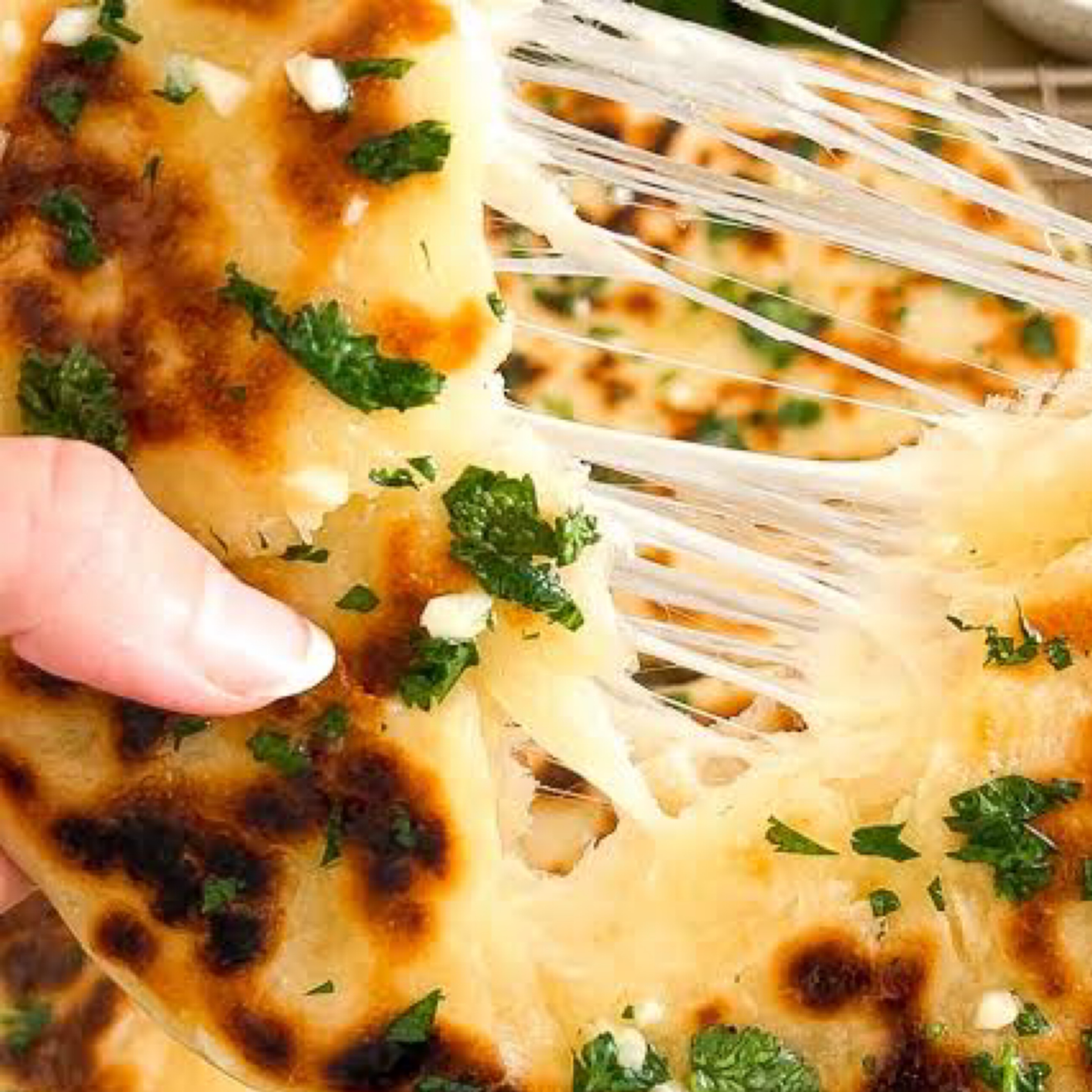 Naan stuffed with a mixture of cheddar and mozzarella cheese and herbs on Top