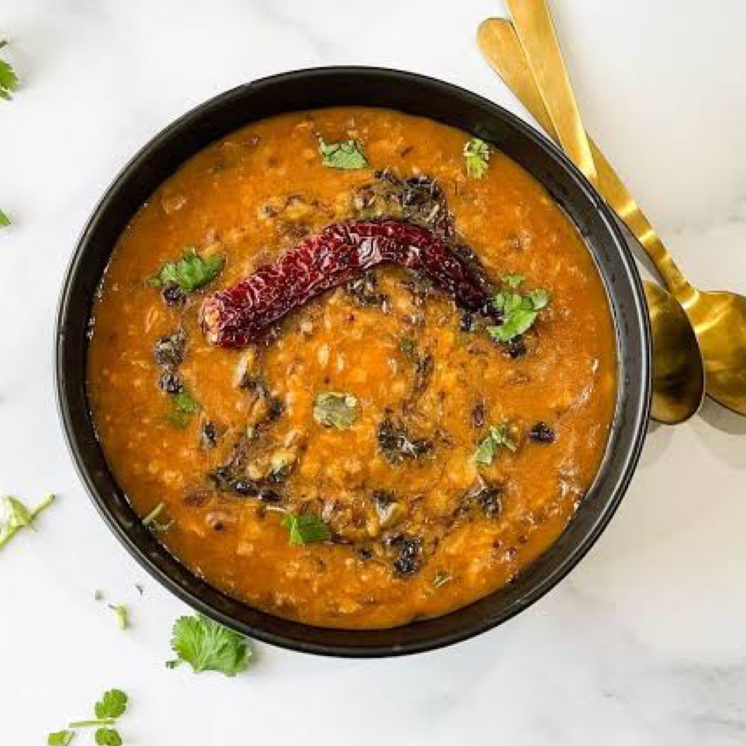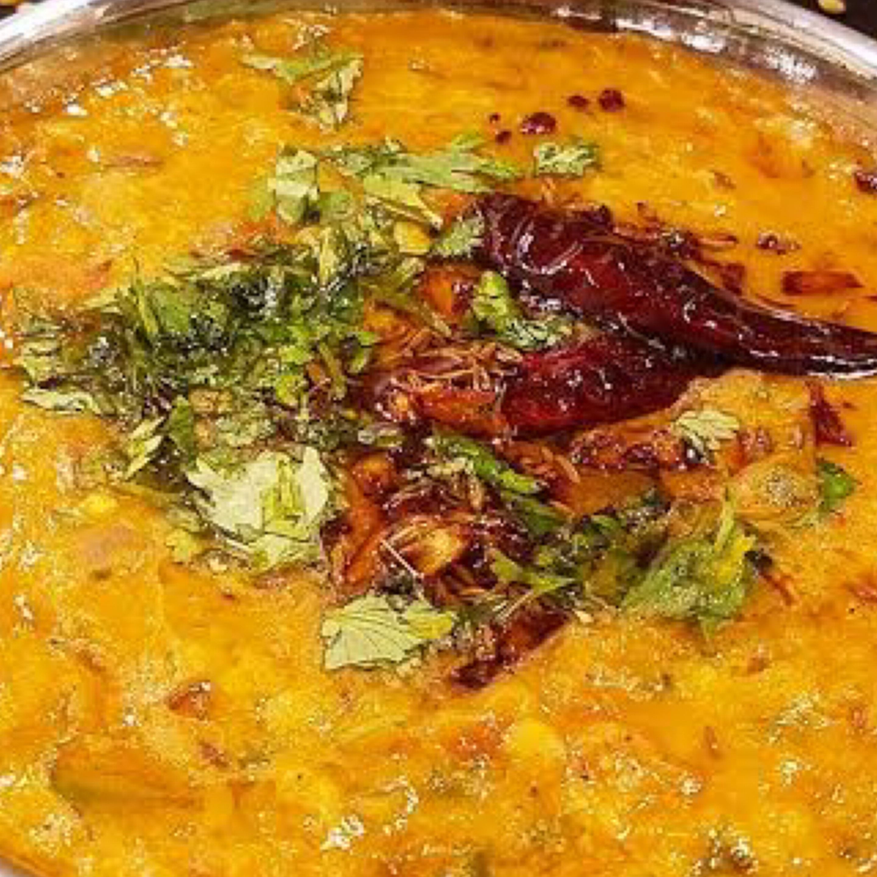 Smooth red and yellow lentils are delicately seasoned then topped with browned onions and hot chilli pepper.