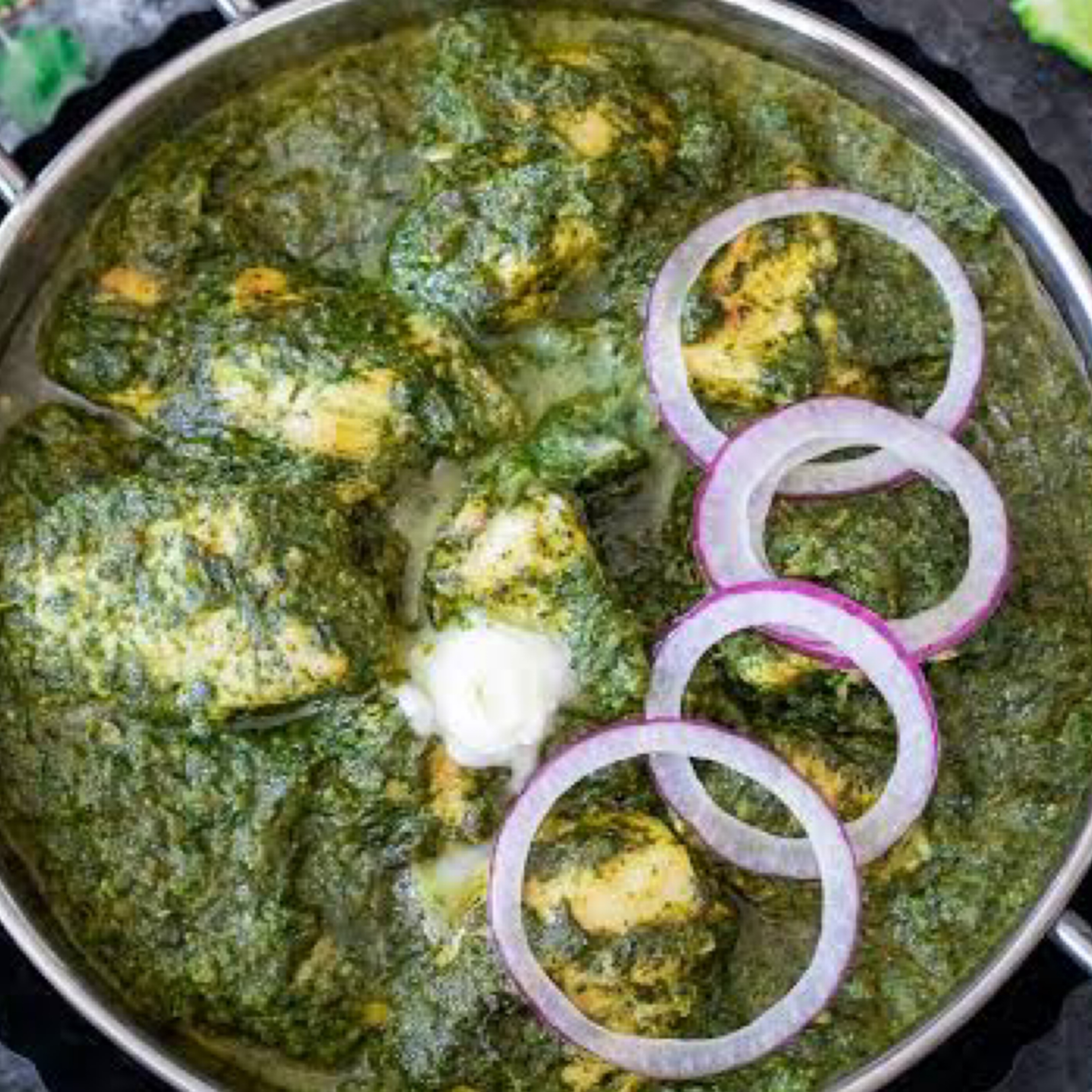 Indian cottage cheese cooked in a creamy spinach sauce and garnished with ginger juliennes