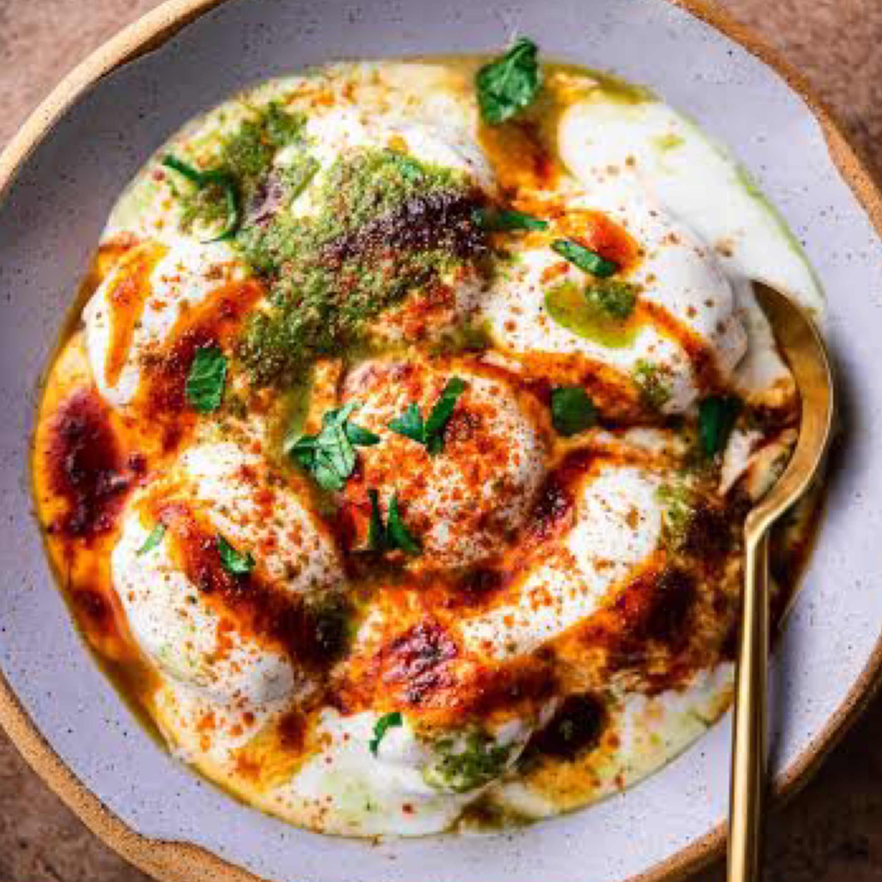 Khasta Kachori dipped in chilled sweet yoghurt topped with Tamarind & Mint Sauce