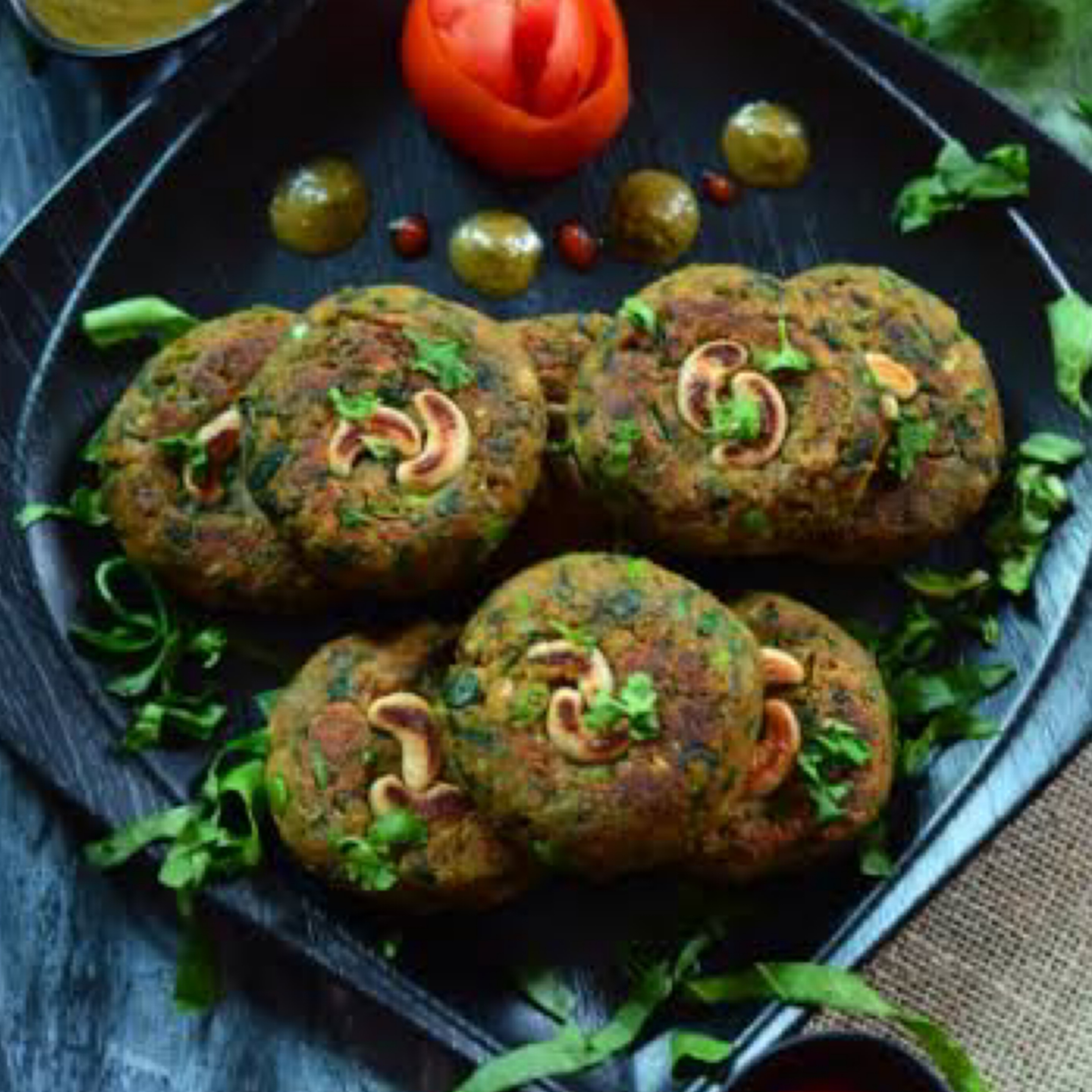 2 Homemade savoury cutlets (Tikki) served with chickpeas, chopped onions and tamarind chutney
