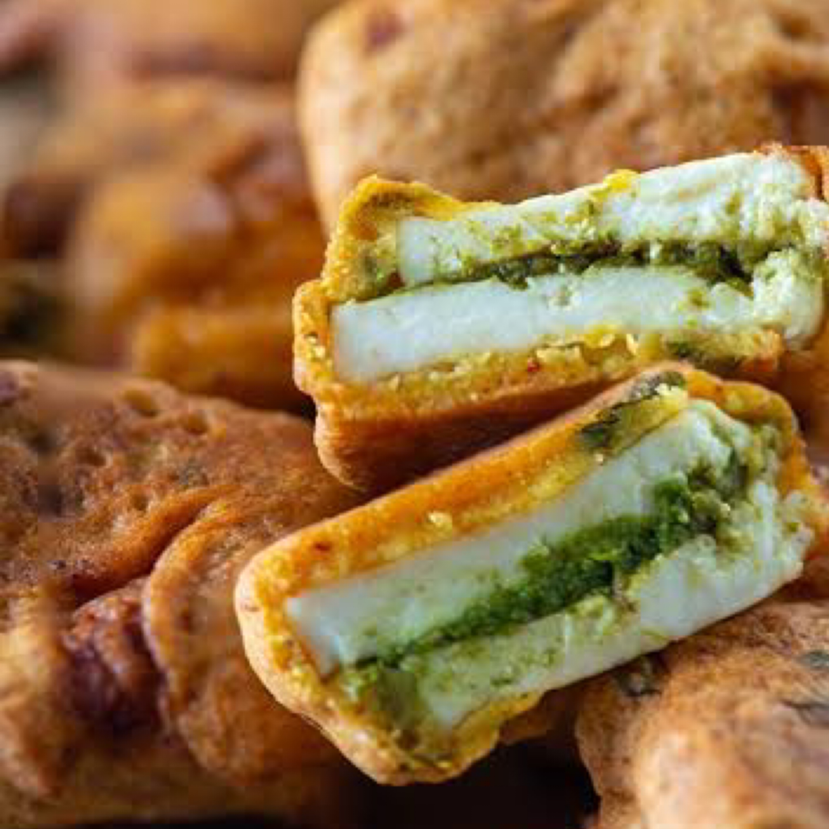 Cottage cheese dipped in chickpeas batter and fried to perfection
