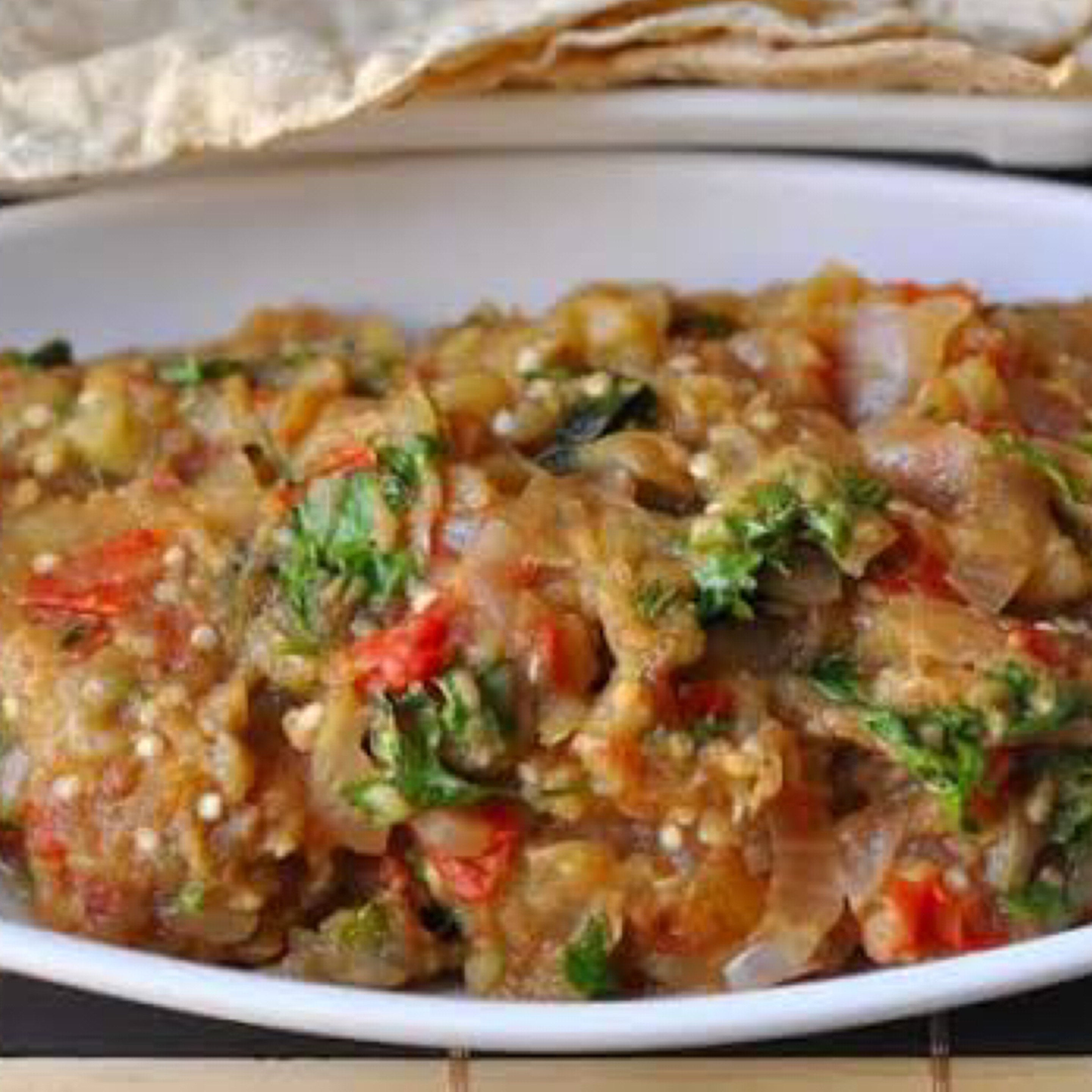 Roasted Eggplant mashed and tossed with onion and tomato