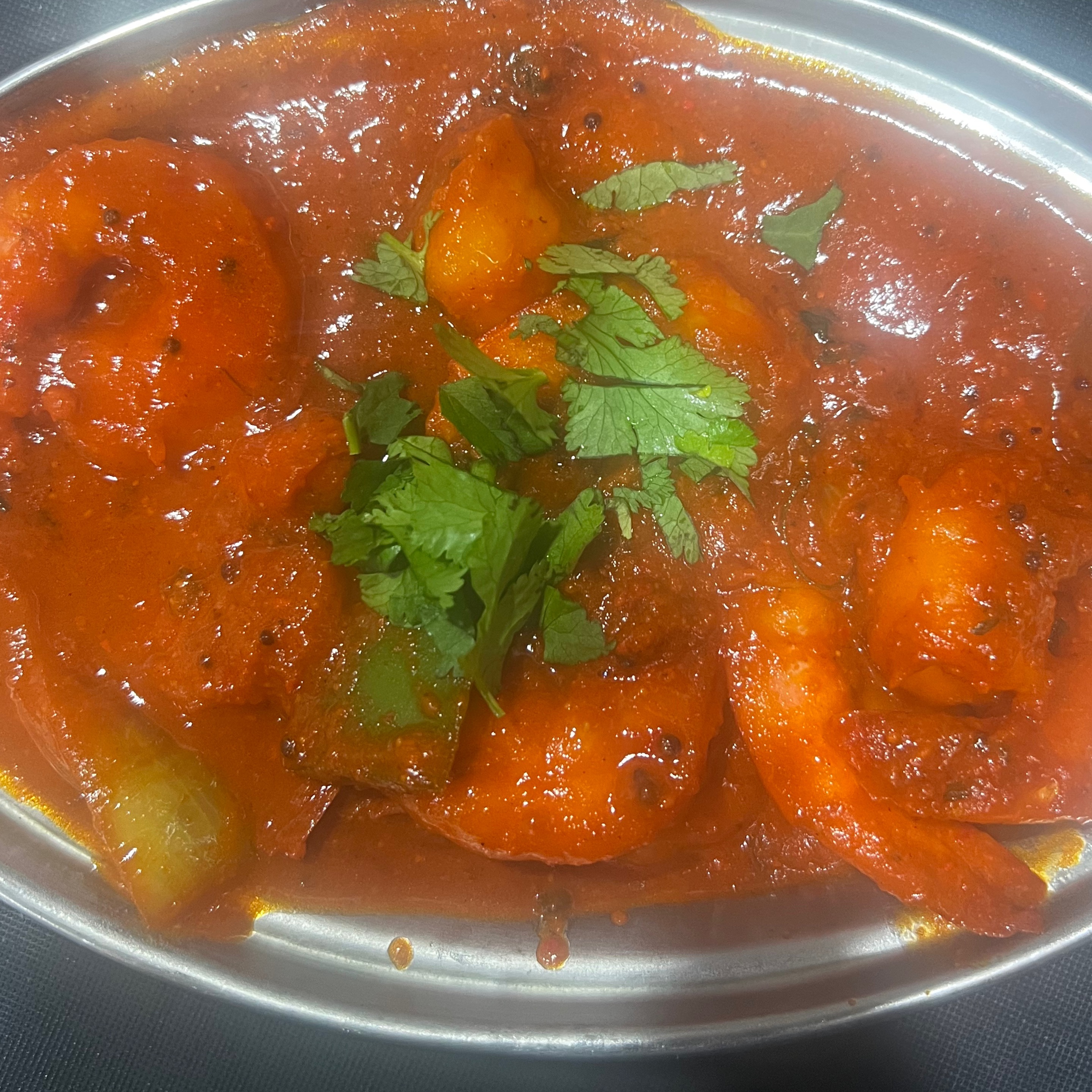 Prawn batter fried and tossed in a chilli garlic sauce.